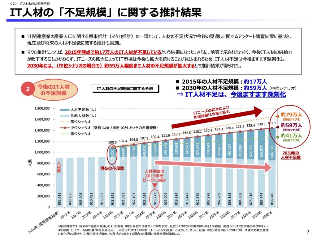 | 将来性 | 業界による (資格によっては、需要が低下傾向) | 高い (IT人材不足は2030年に約79万人で、 今後も需要拡大) |